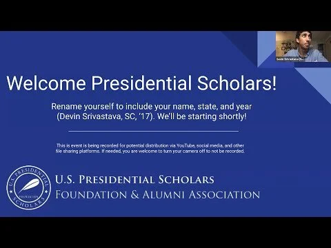 U.S. Presidential Scholars Foundation routinely hosts virtual events. From political shakers and scientific experts to business leaders and creative thinkers, PSF proudly celebrates the variety of skills and talents across the Presidential Scholar community. Select event recordings can be found below, as well as on the U.S. Presidential Scholars YouTube channel. For up-to-date information on upcoming virtual events, join PSF on Facebook, LinkedIn, and Instagram!